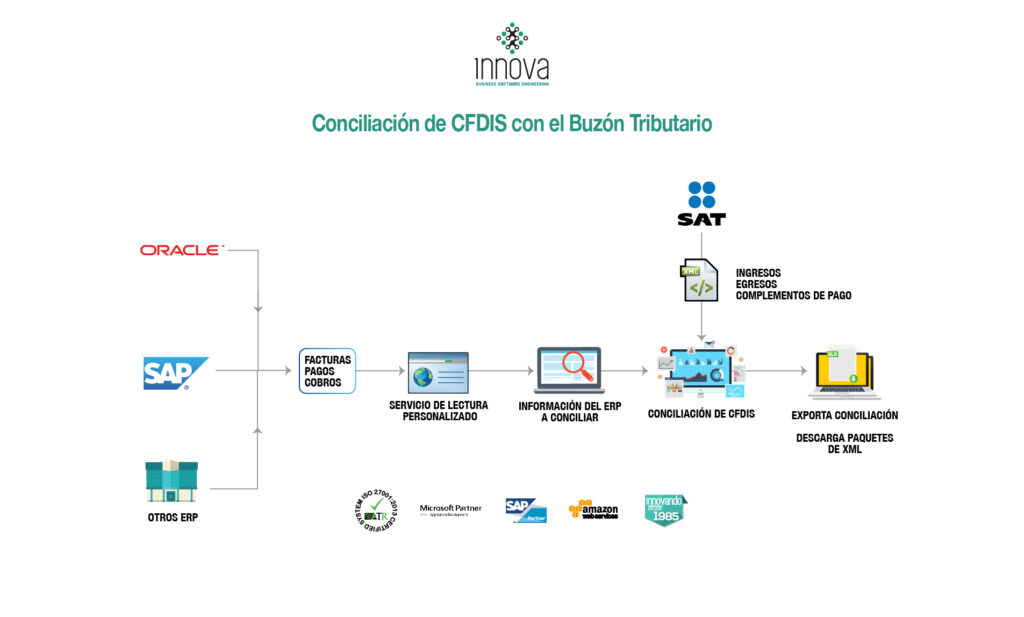 Solución compatible con Oracle y SAP para validación de CFDIS emitidos y recibidos con el buzón tributario, descarga de CFDIS faltantes en el ERP y conciliación de importes.