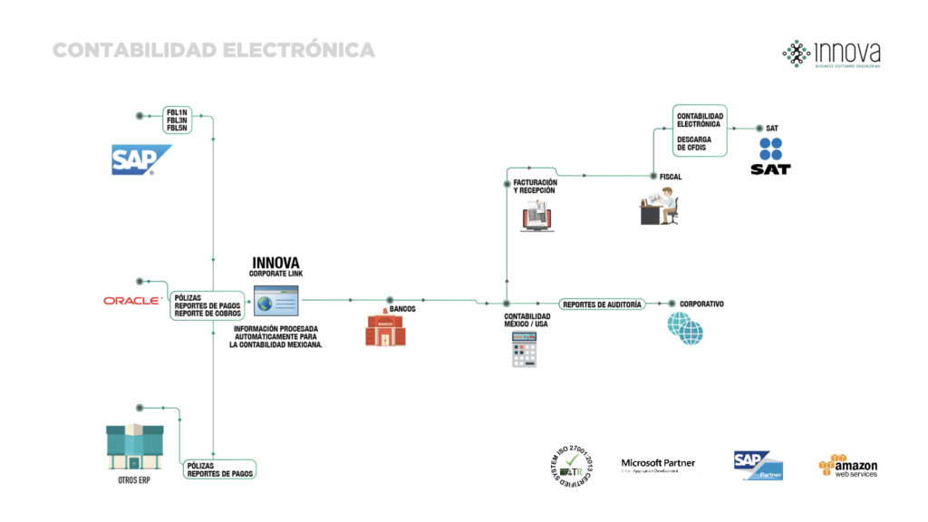 Solución compatible y complementaria con SAP y ORACLE para determinar la contabilidad electrónica partiendo de la información de su ERP. Sin doble captura emita los archivos XML.